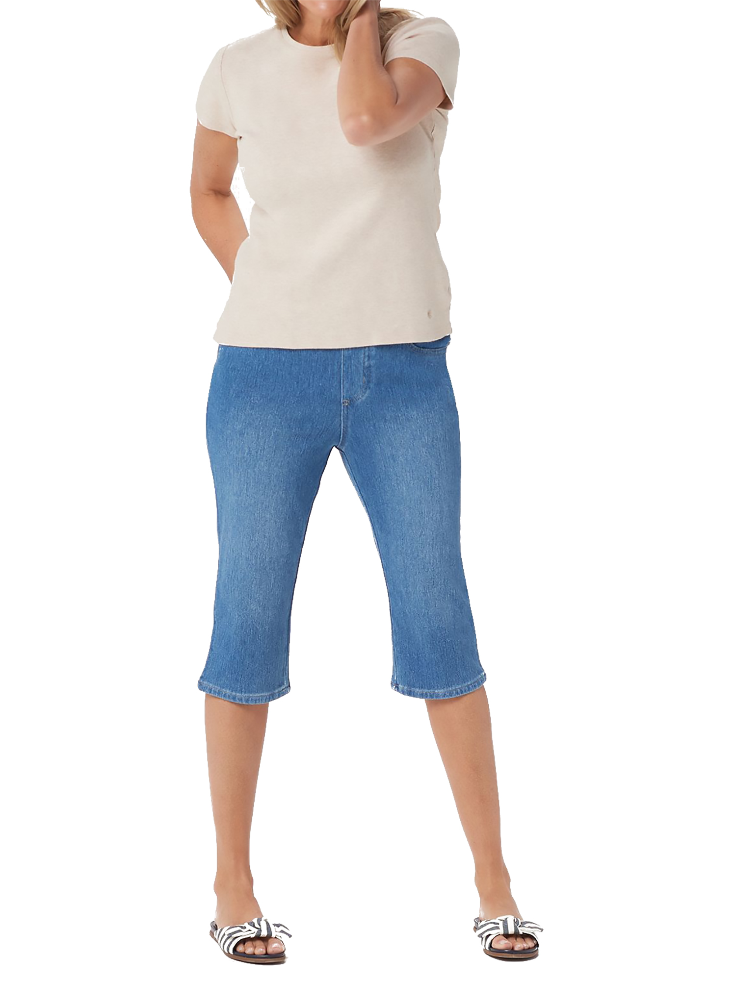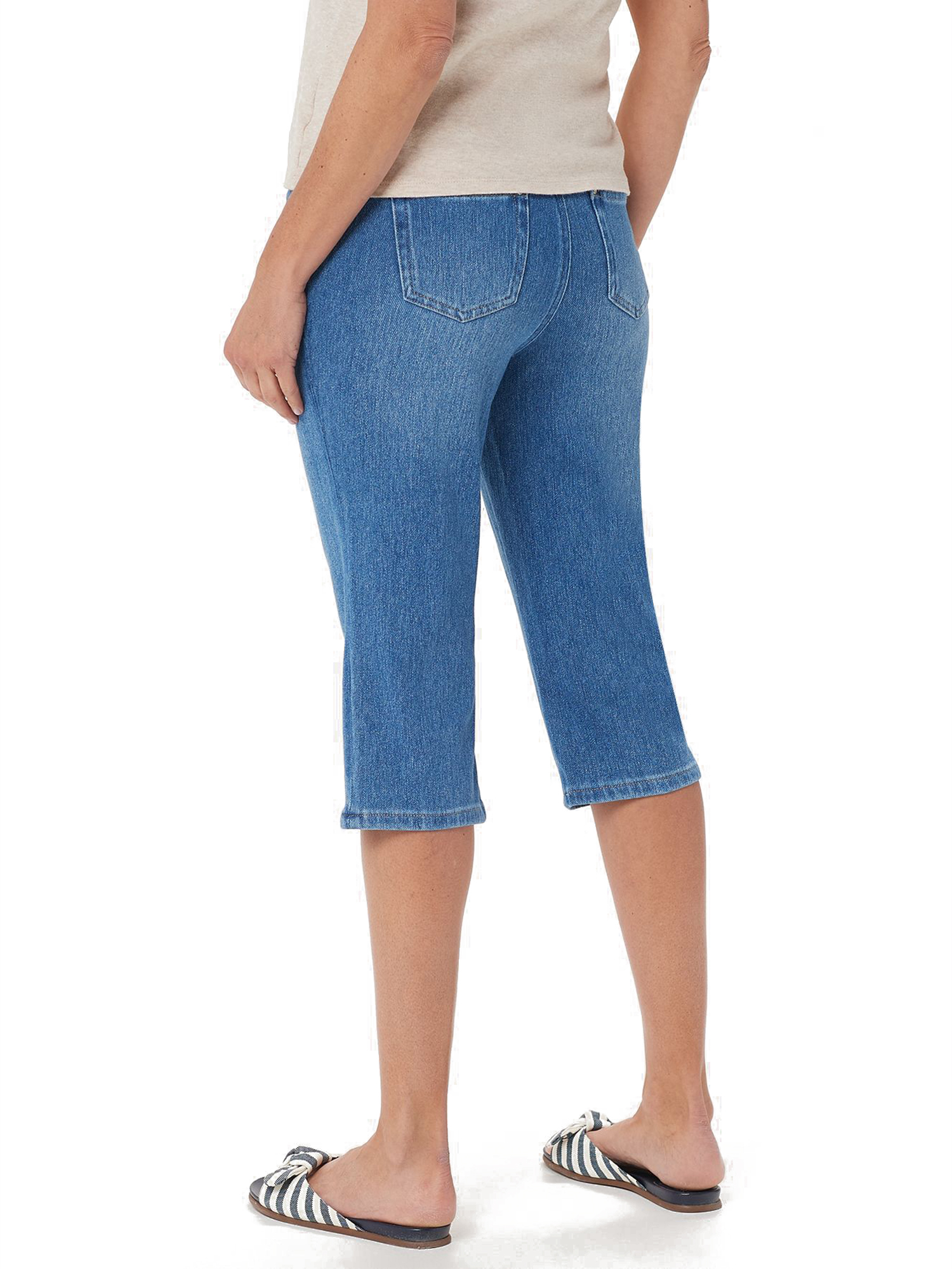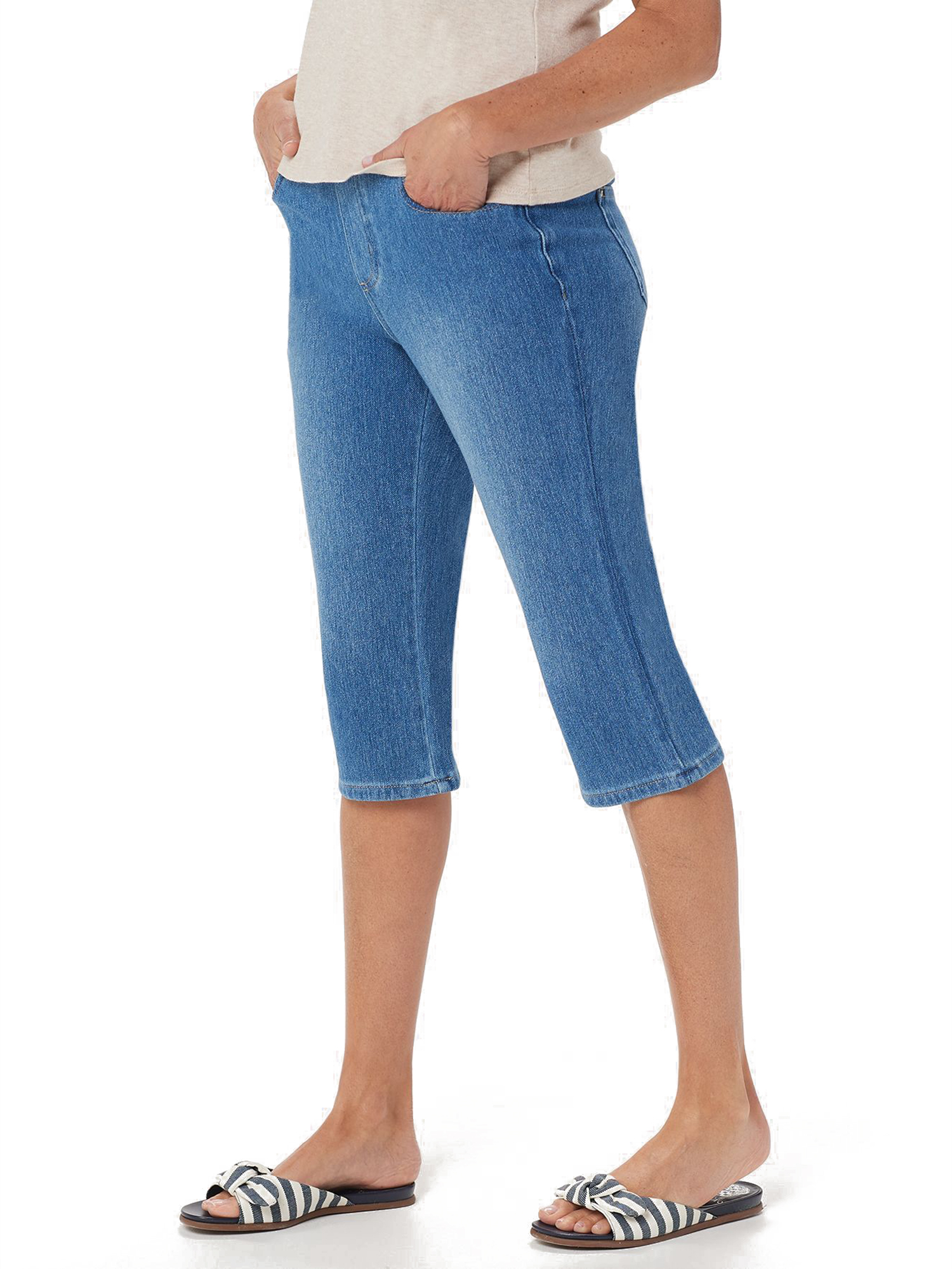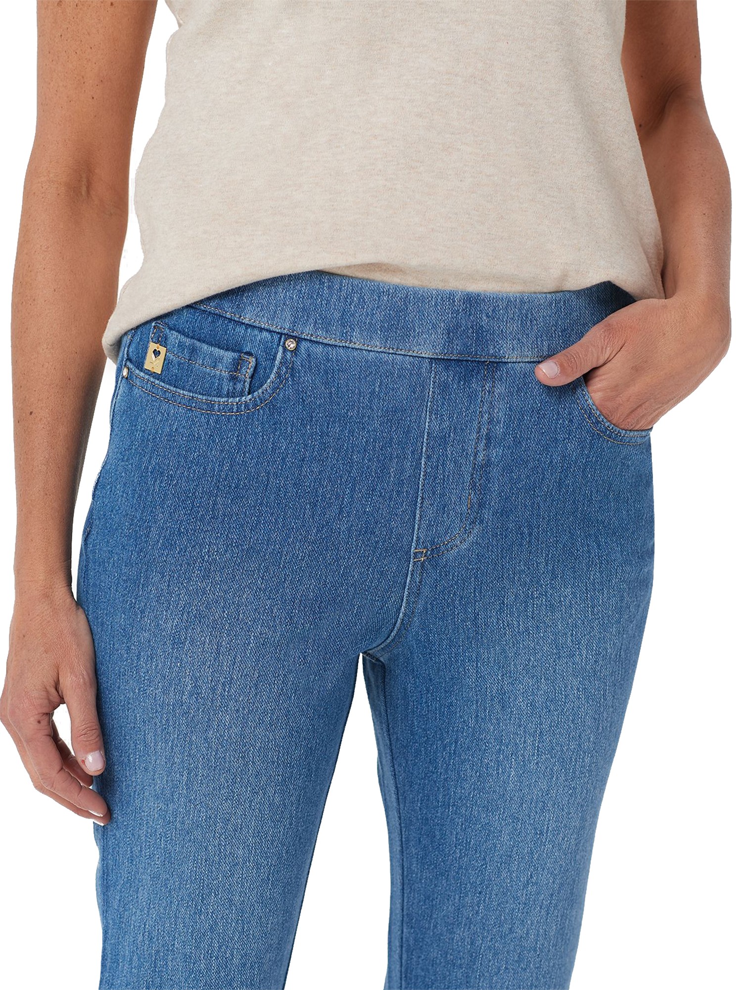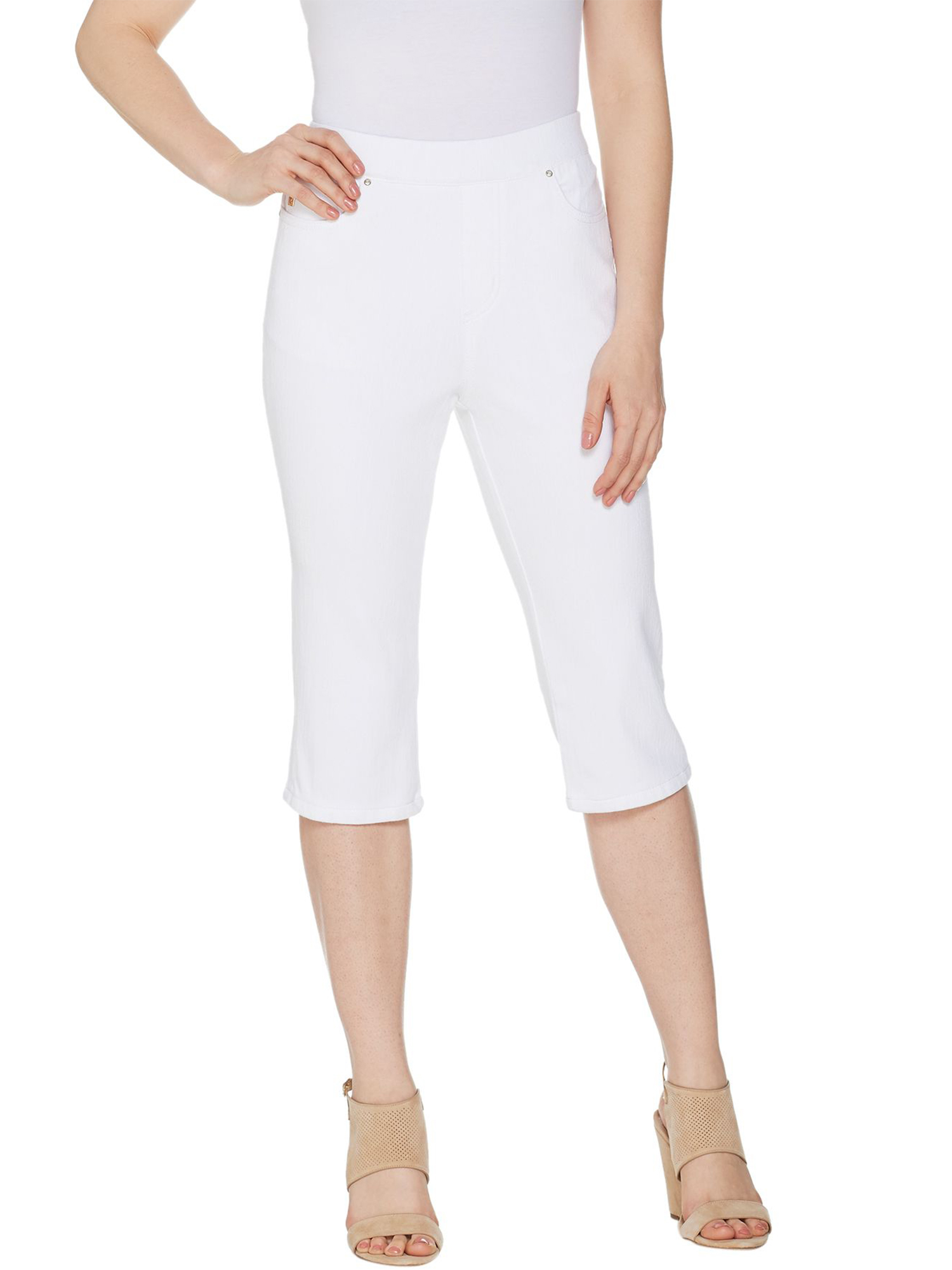 - Features: pull-on style, cropped length, faux fly zip, five pockets