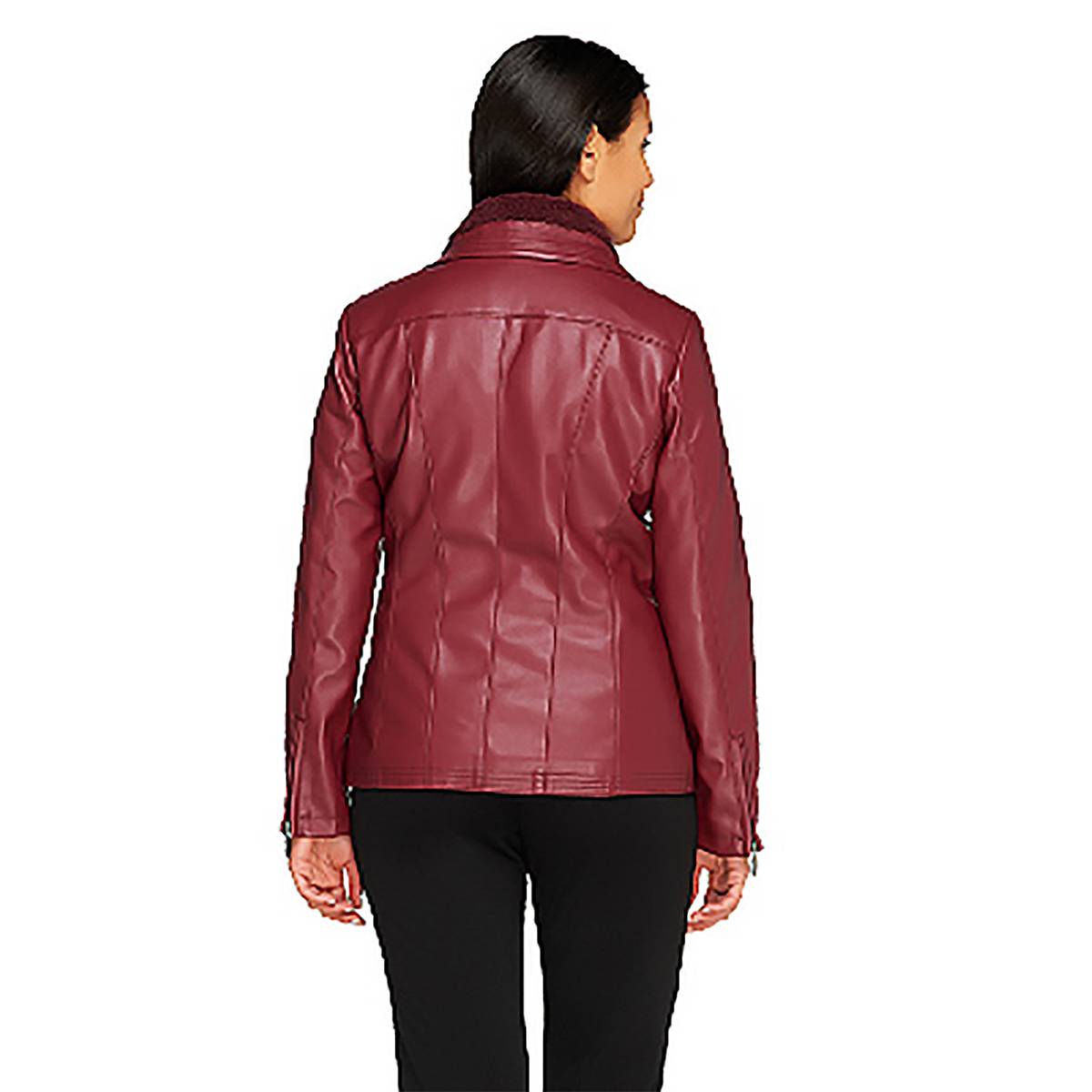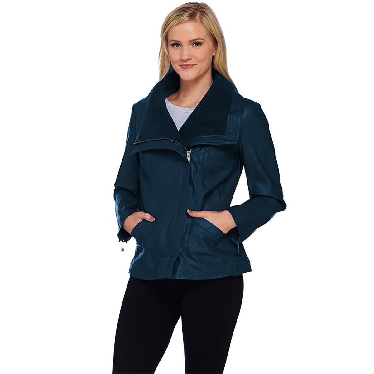 City slicker. In this Denim and Co. design, you get the rich look of leather and the sumptuous softness of sherpa without the expense or high maintenance. Princess seams imbue the jacket with great, figure-flattering shape, while zipper details lend an elegantly edgy finishing touch. From Denim and Co.(R) Fashions.