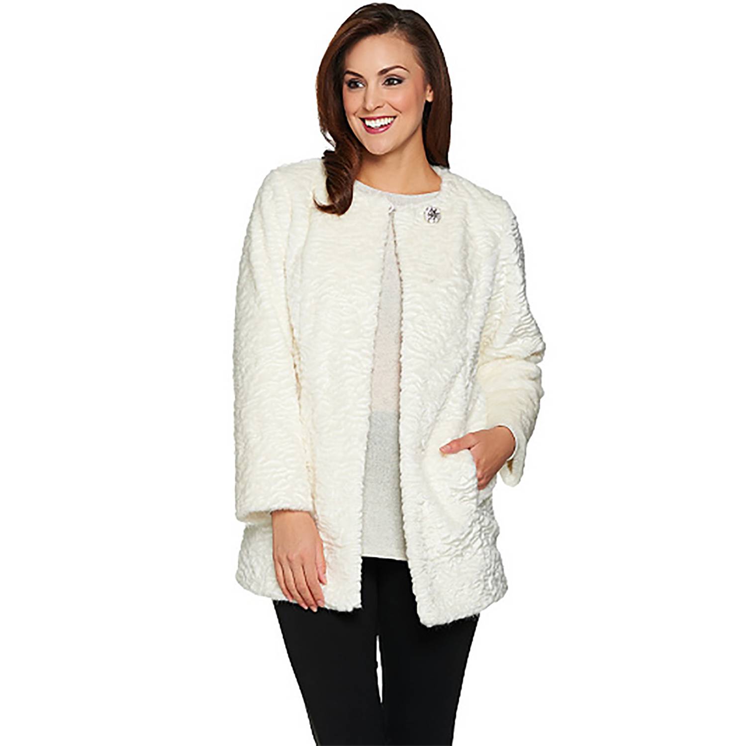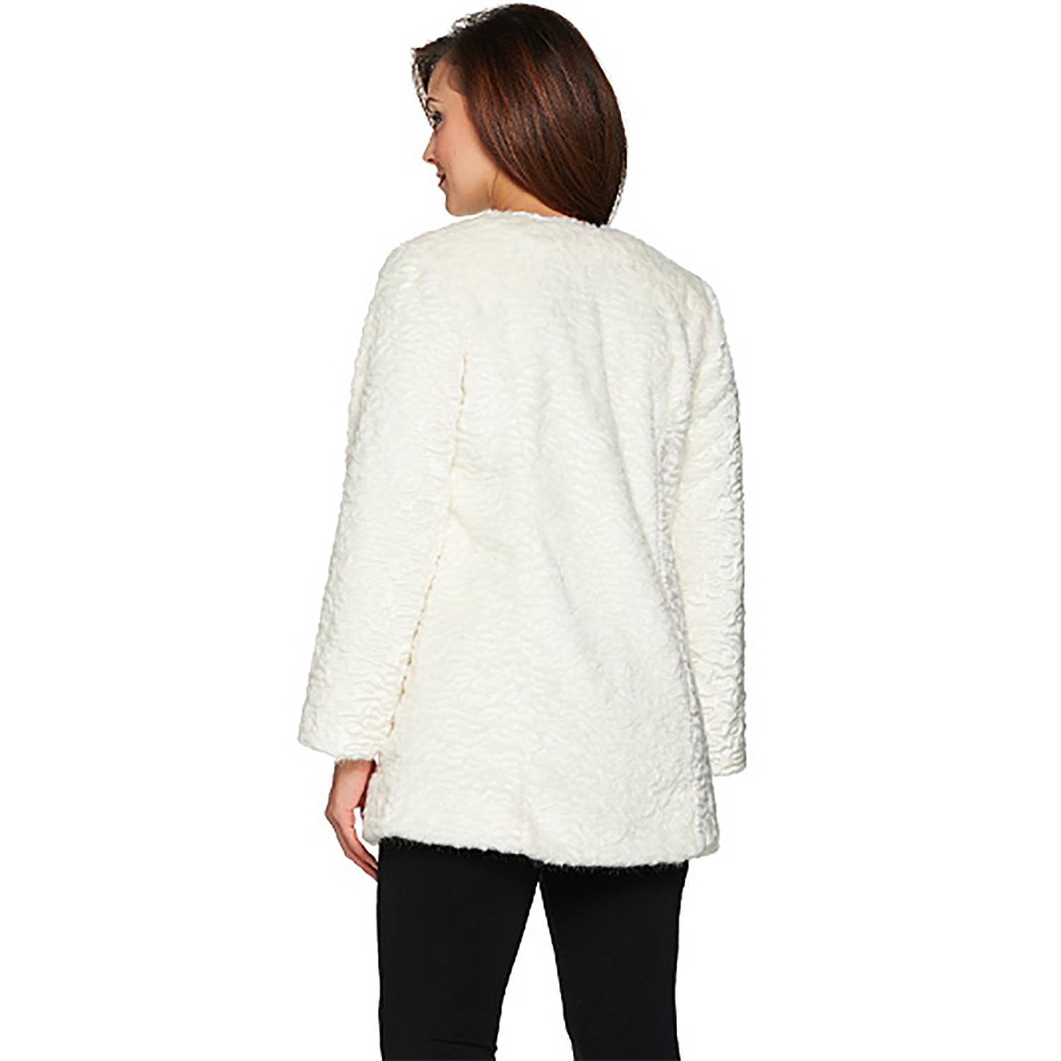 - Features: allover Persian lamb faux fur, collarless, long sleeves, side slit pockets