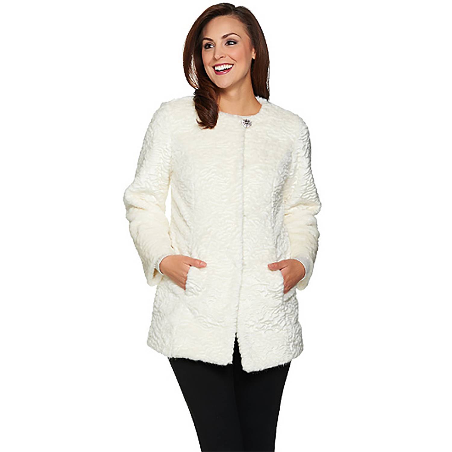 Glamour girl. Make a celebrity-style entrance when you wear this fabulous faux-fur coat by couture designer Dennis Basso. The luxurious exterior, collarless styling, front hook-and-eye closures, and single crystal button at the neck mirror genuine fur coat detailing–but it’s faux. Who’s to know? From Dennis Basso.