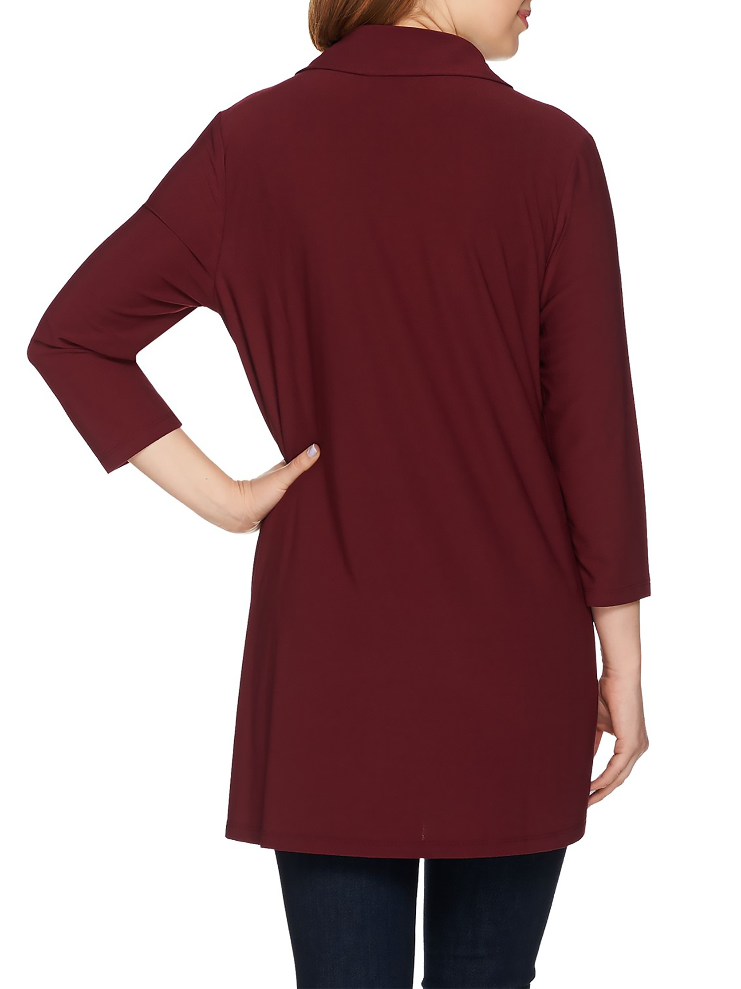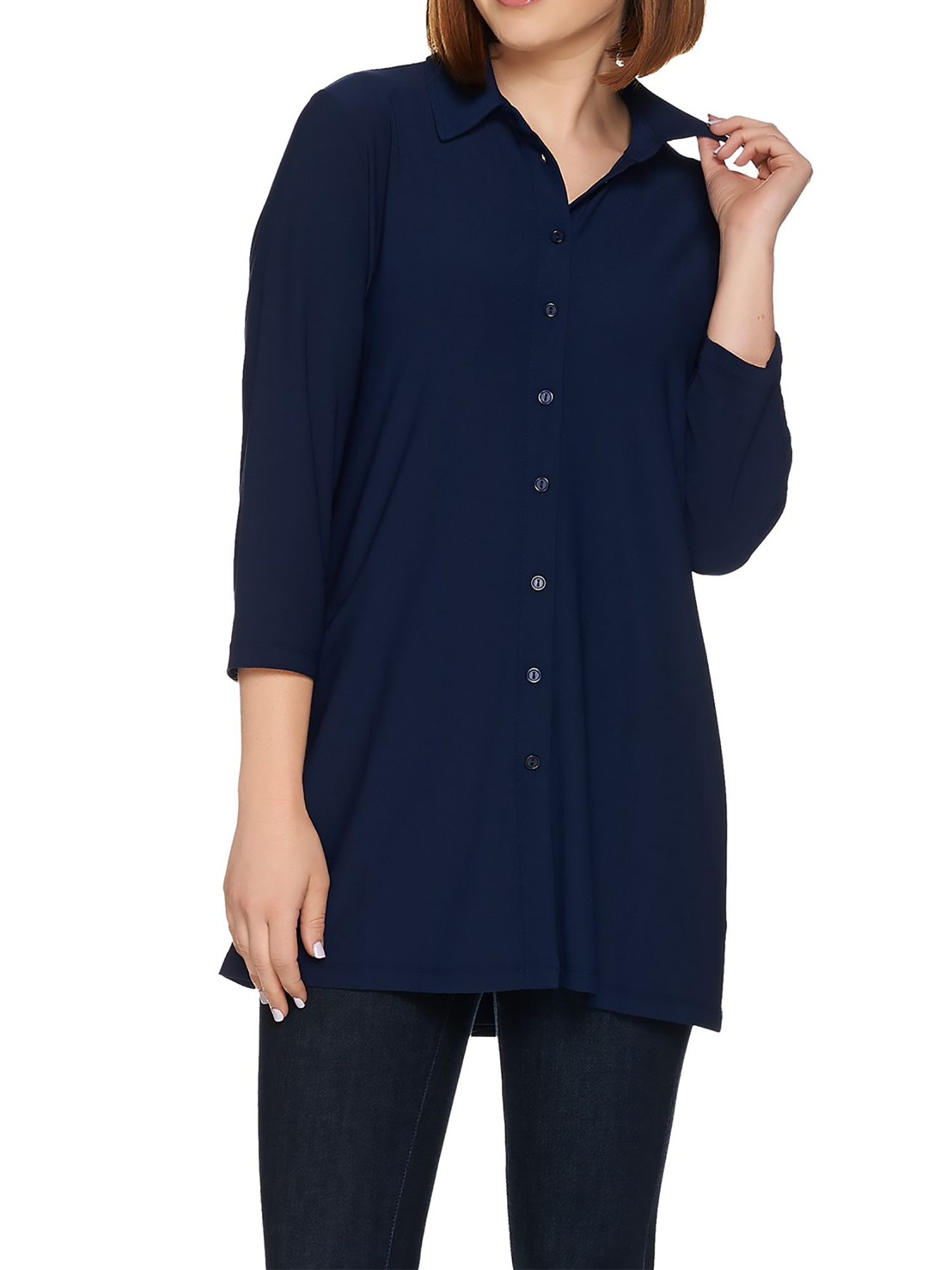 - Features: shirt collar, button-down front closure, 3/4-length sleeves, side seam pockets, straight hem