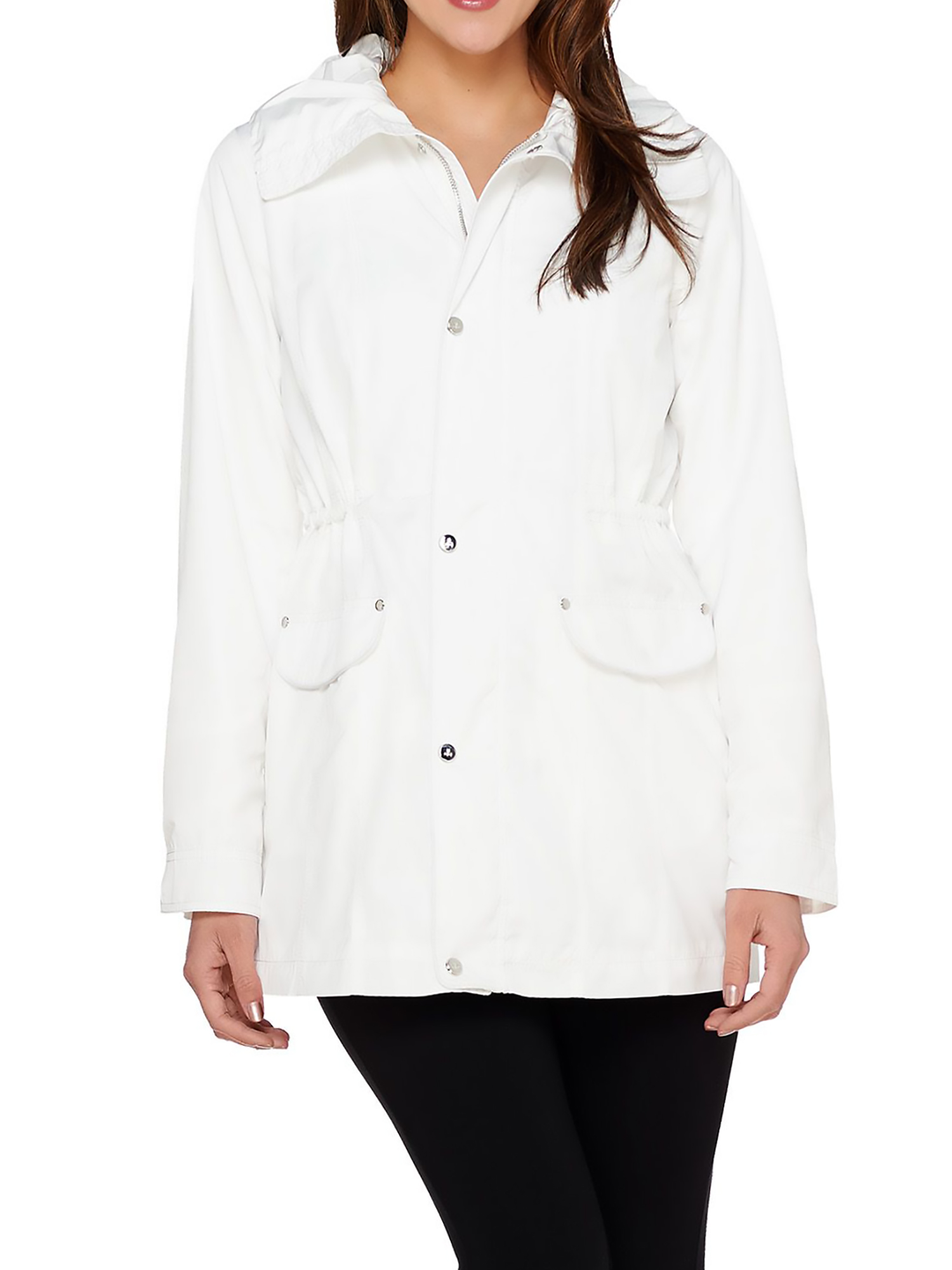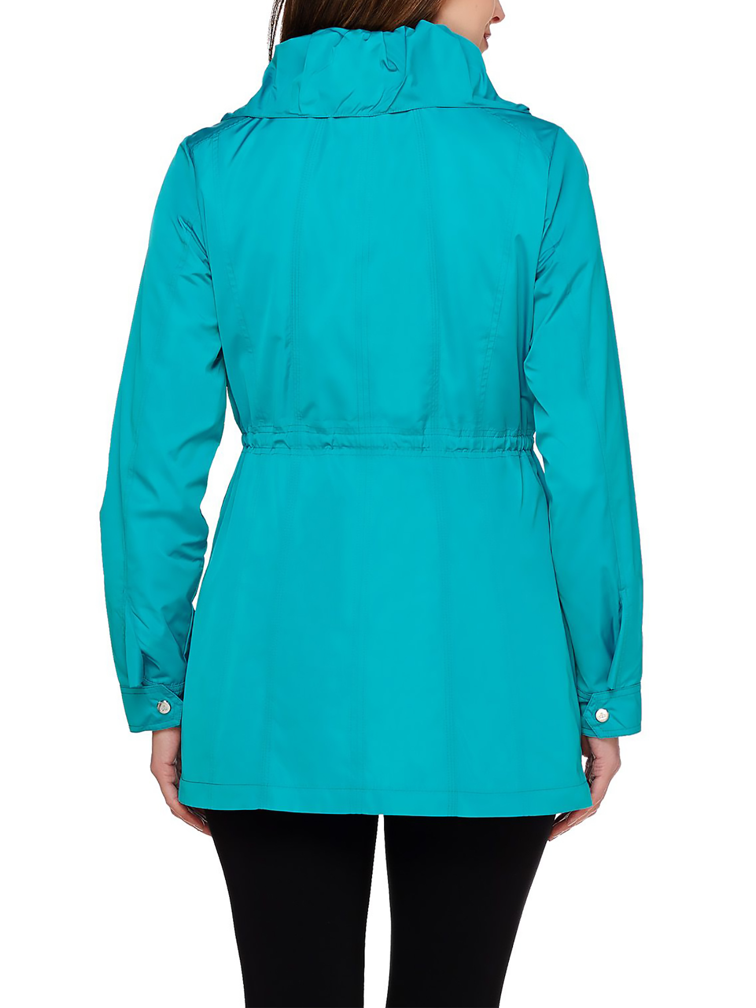 - Features: water resistant, stand collar with tuck detail, snap placket with hidden zip closure, self drawcord at waist