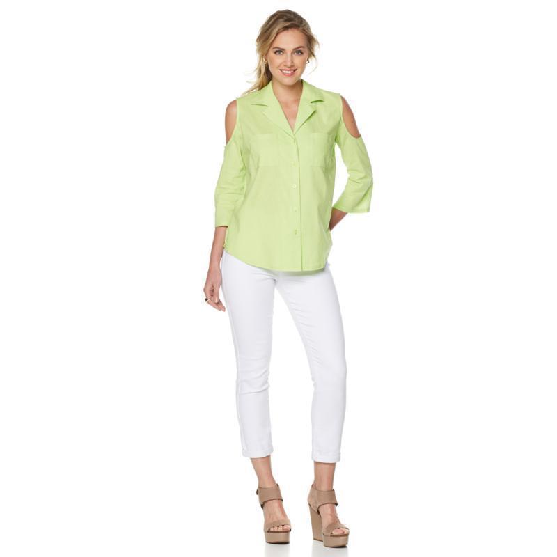 If you love linen, give this cold-shoulder top a try. It has a classic button-down style but with exposed shoulders for an updated look. With 3/4 sleeves you get coverage even while baring a little skin.