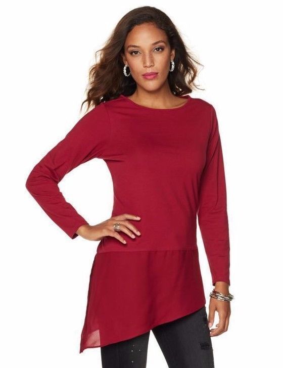A combination of lightweight knit and breezy chiffon brings a feminine flair to this classy top. The sheer layer creates contrast even in a tonal palette. We love the side-slit diagonal hemline over a skinny pant Silhouette.