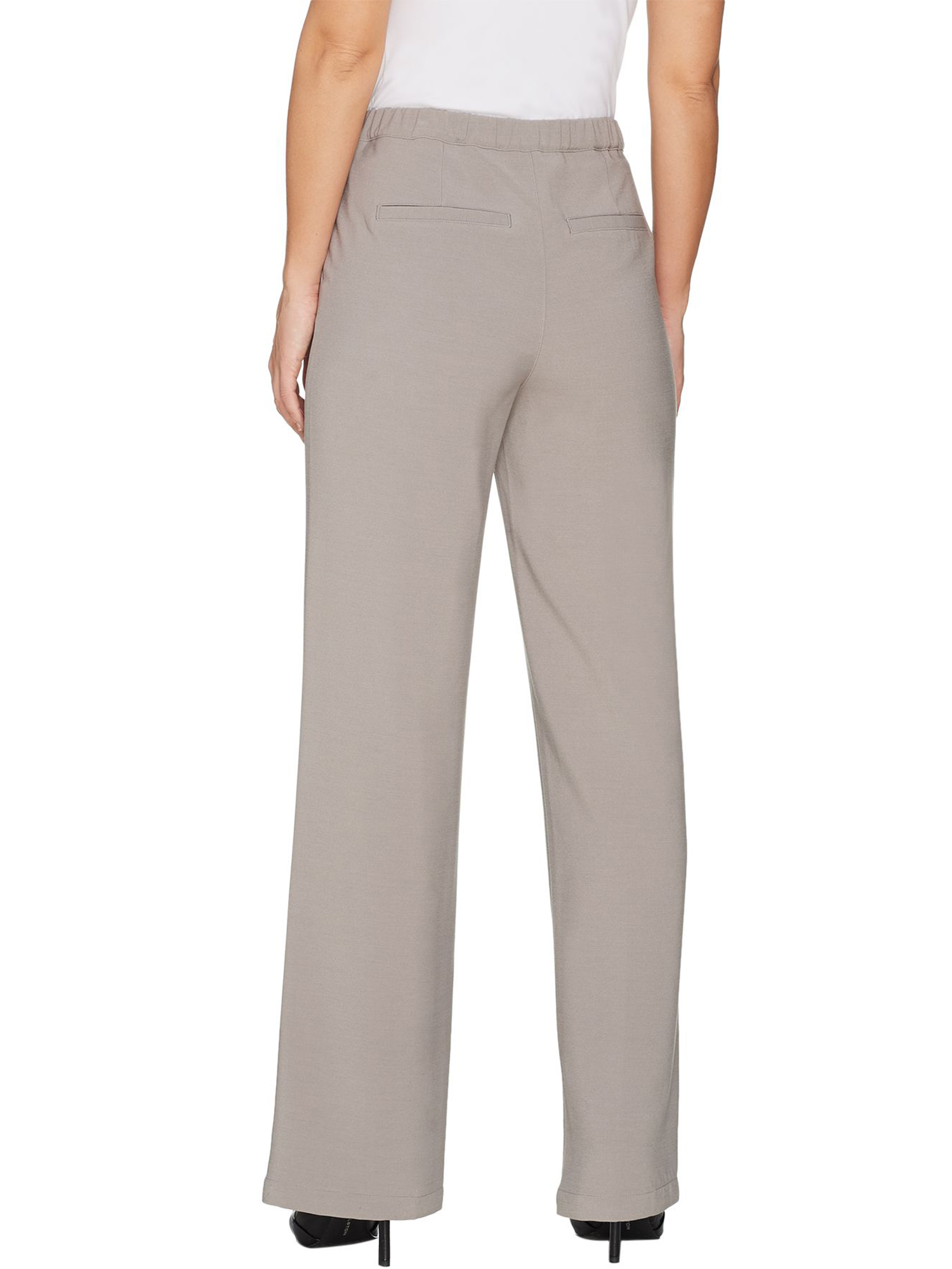 - Features: encased elastic waistband along back, two hip functional pockets, two back faux nonfunctional slit pockets, stitched pleat down front leg