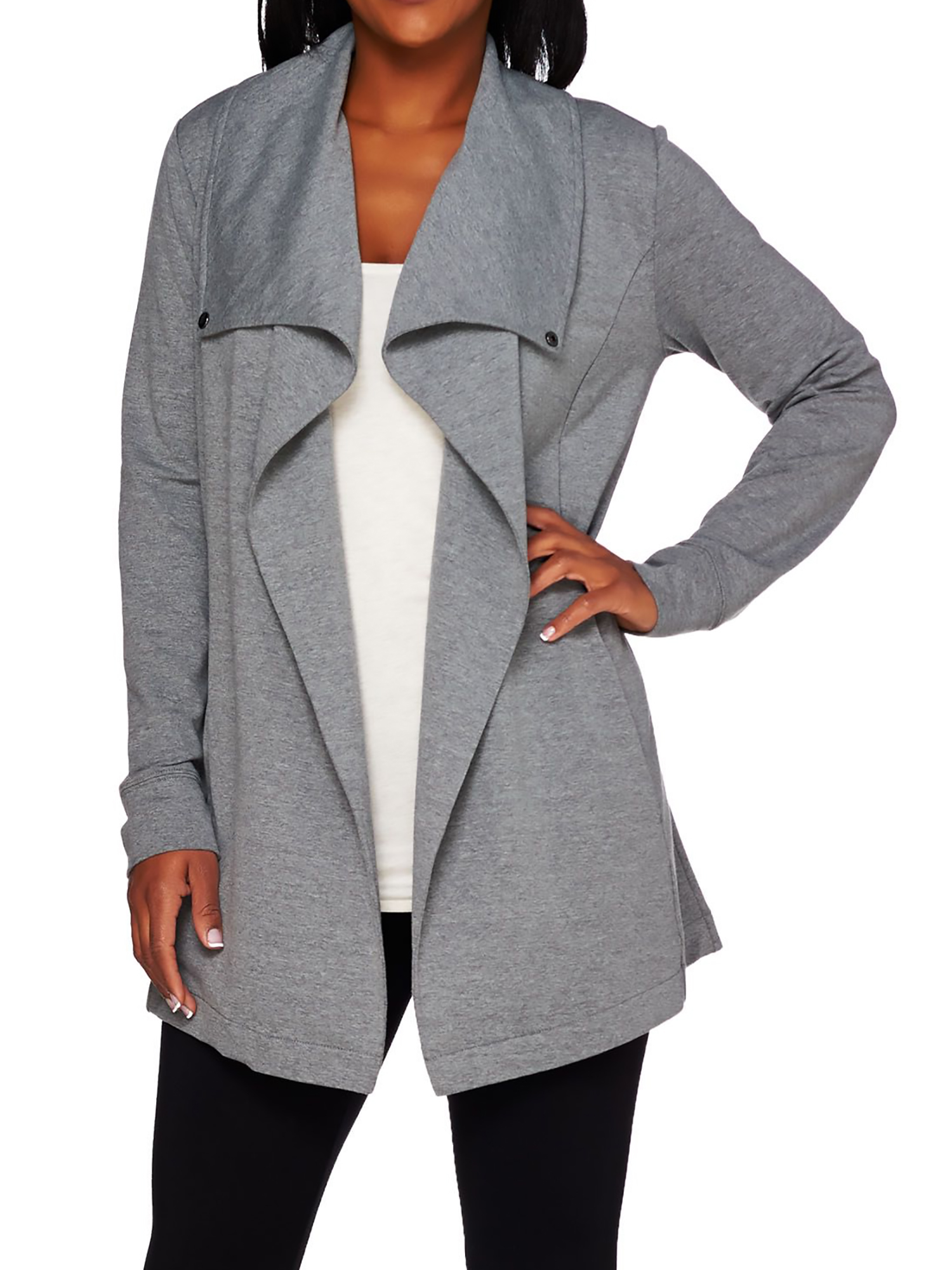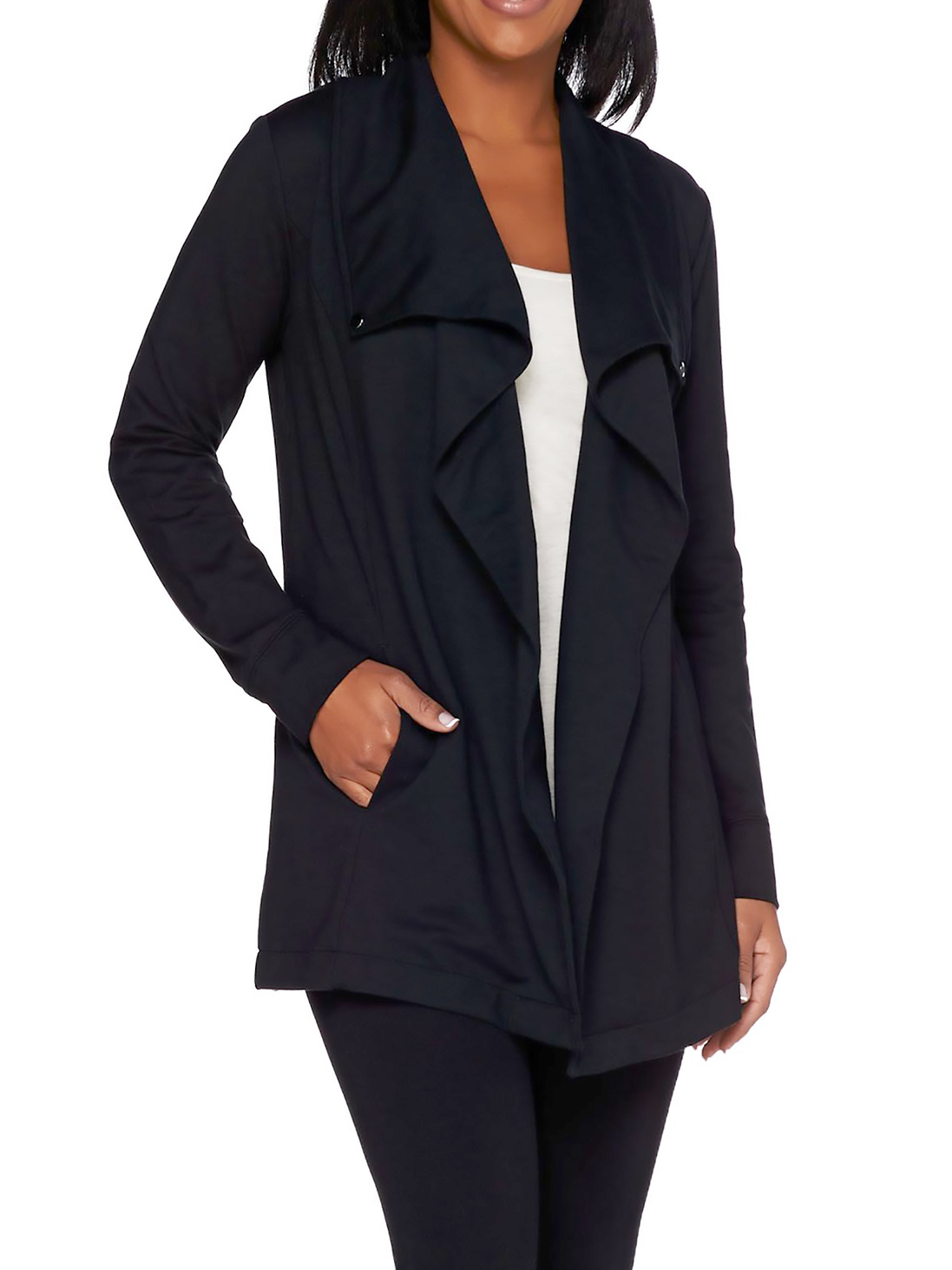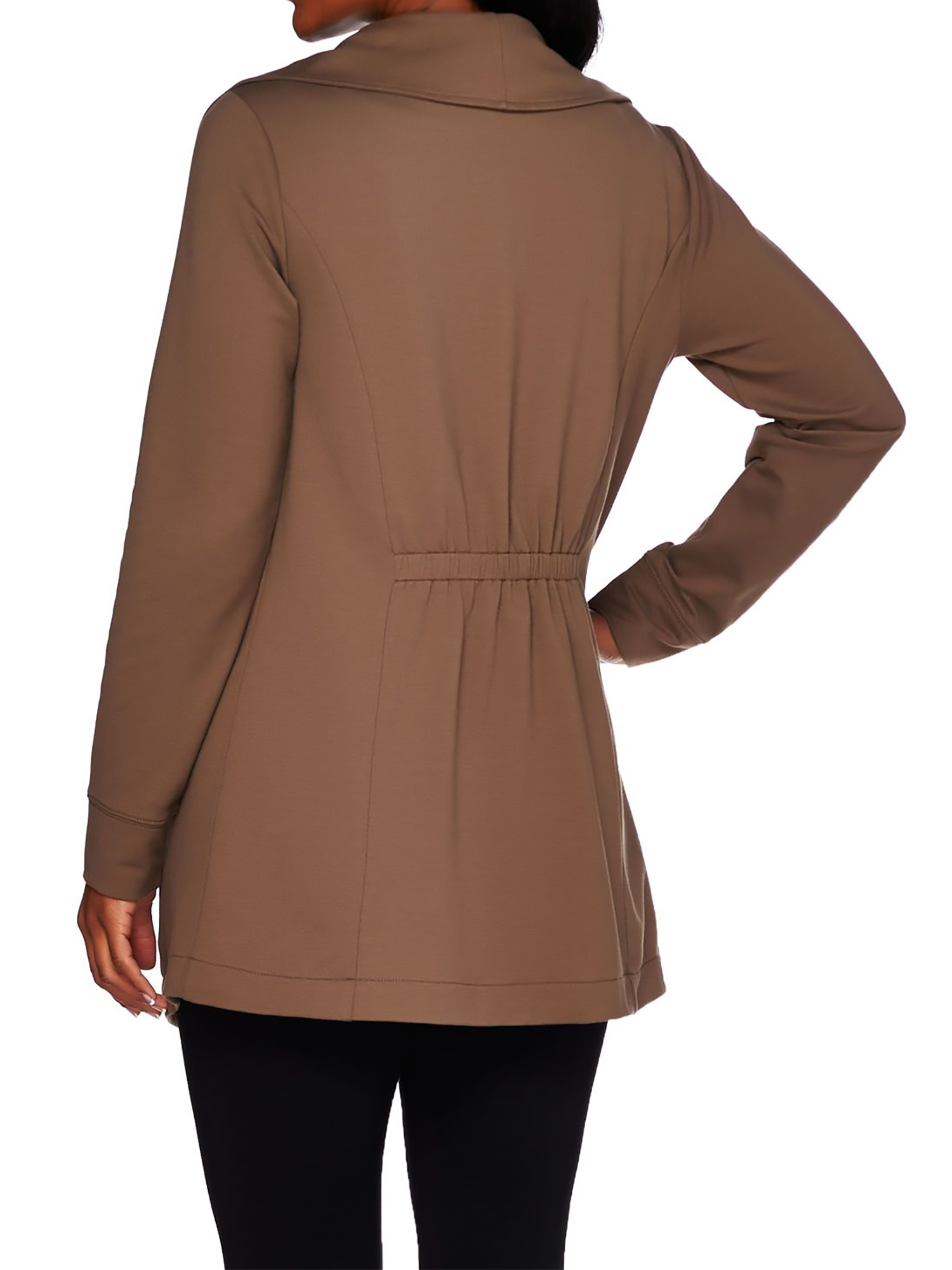 - Features: long sleeves, open front, draped collar, side pockets, back ruching detail