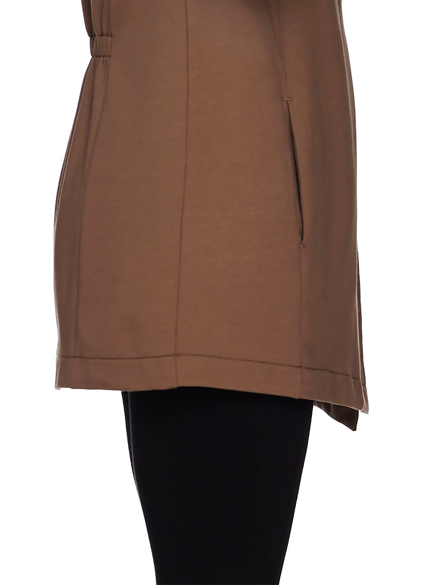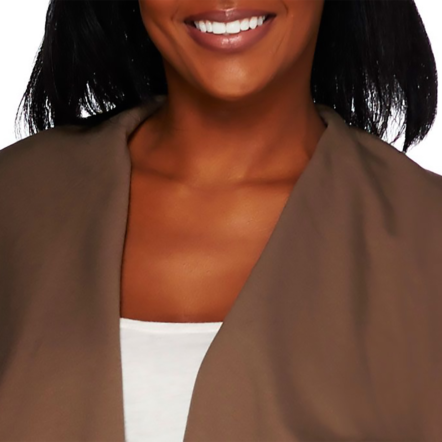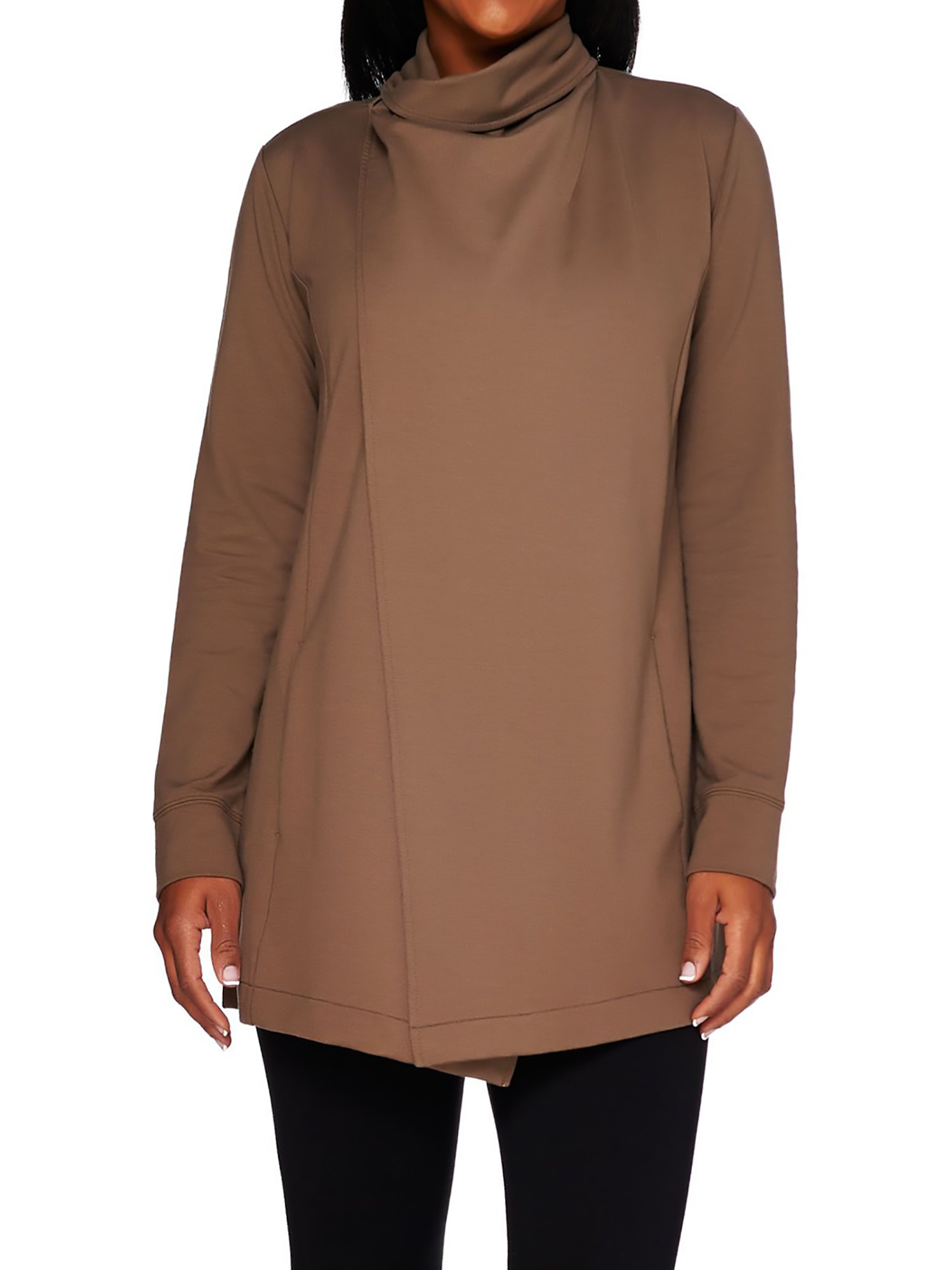 - Features: long sleeves, open front, draped collar, side pockets, back ruching detail