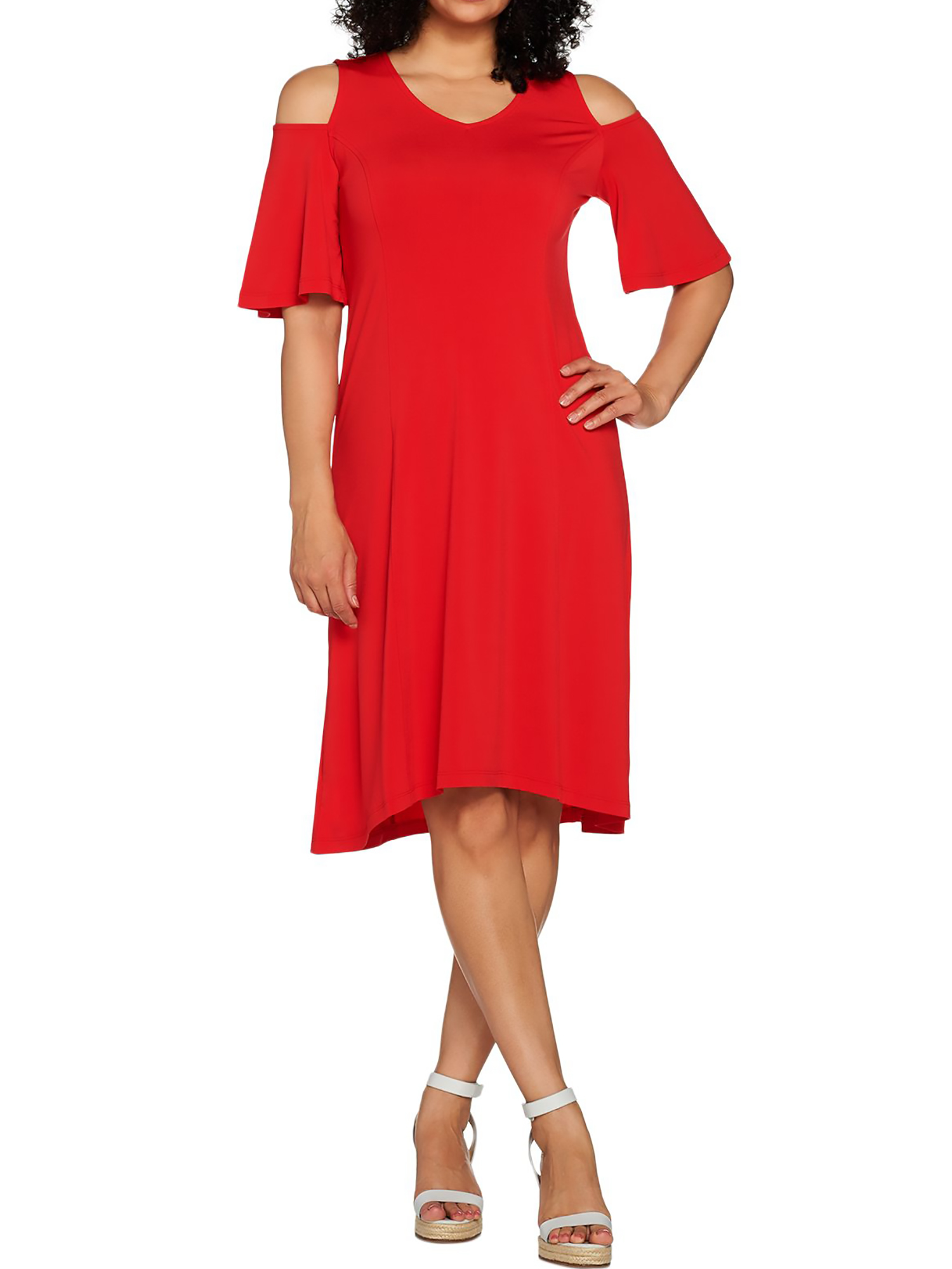 - Features: V-neckline, cold shoulder detail, elbow-length sleeves, front and back princess seam details, keyhole at back neck, slight hi-low hem