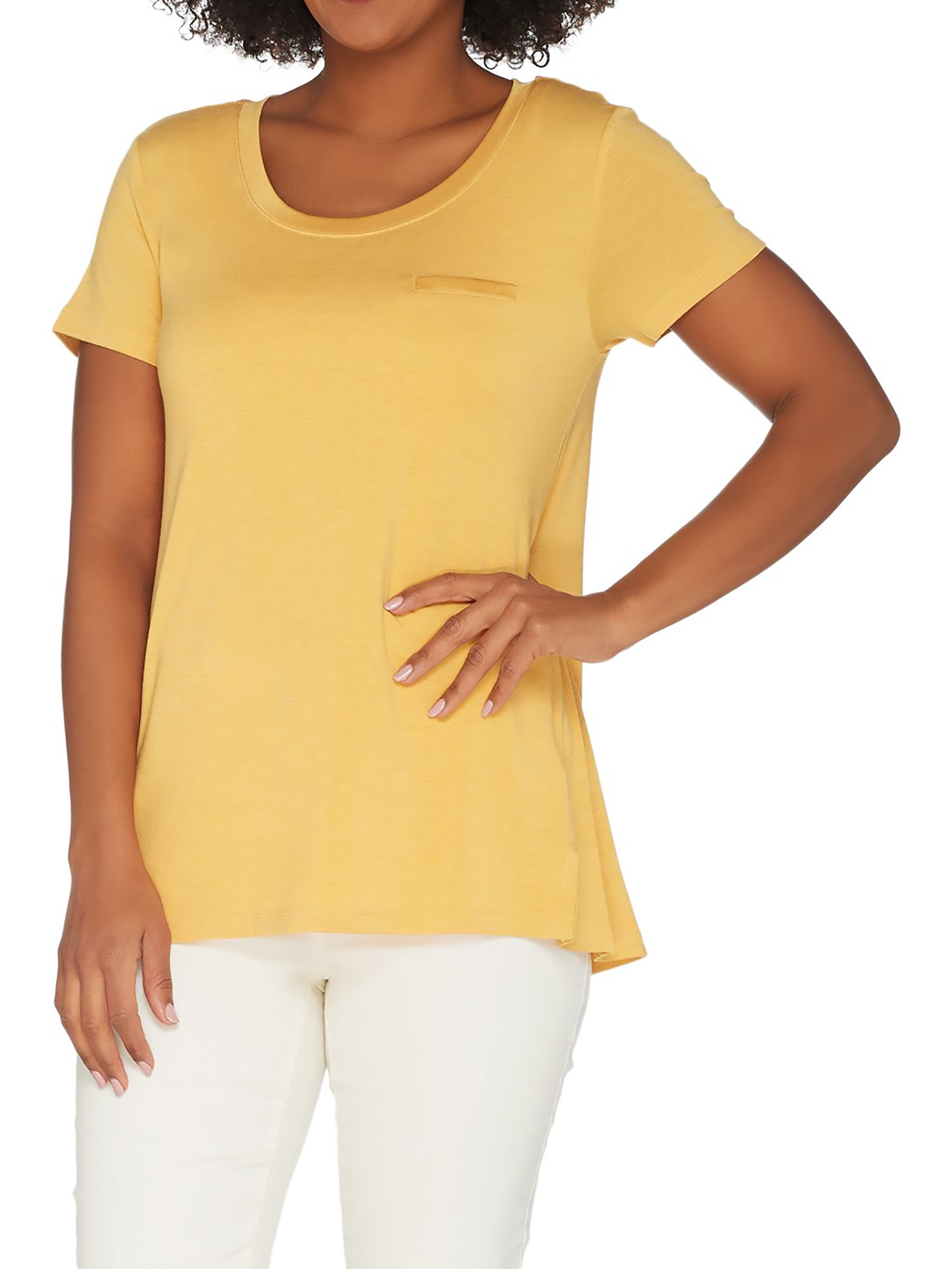 A cute, classic short sleeve tee, like this one with front slits and a faux welt chest pocket, is fundamental to a variety of outfit combinations. From H by Halston.