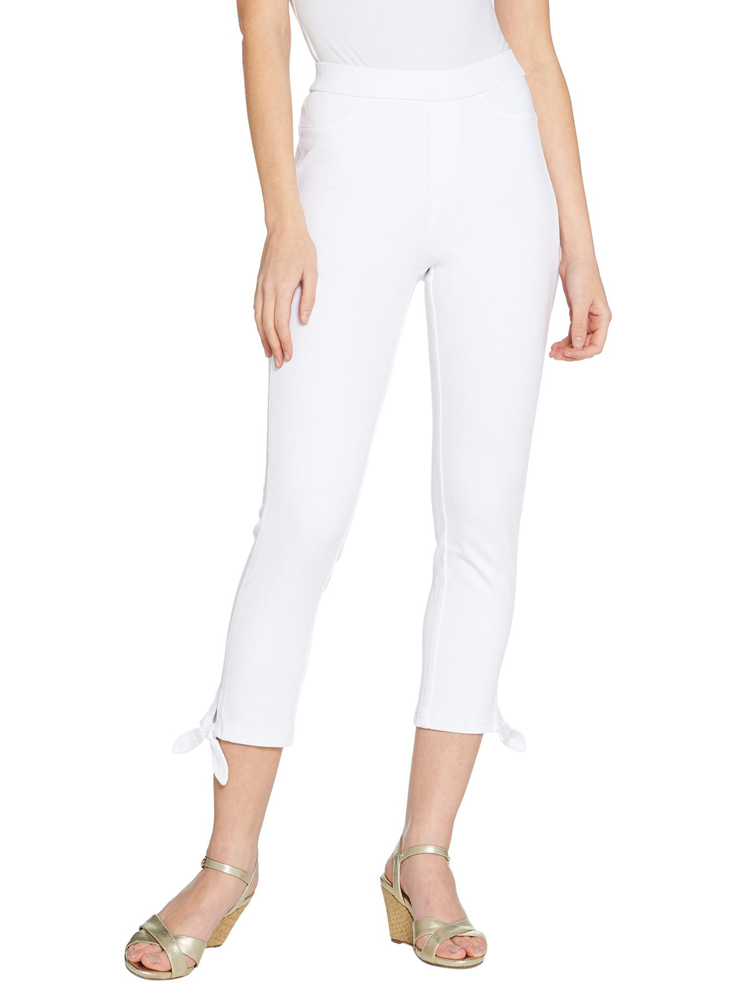 - Features: cropped length, pull-on, encased elastic waistband, two stitched faux-front pockets, two back functional pockets, side tie bottom hem detail