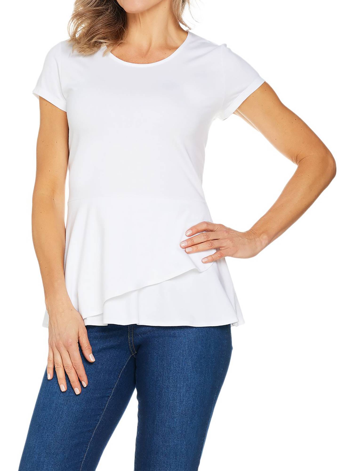 Fancy-free and feminine, this short-sleeved tee takes on a sweet style with a peplum flounce detail below the waist seam. From Isaac Mizrahi Live!(TM).