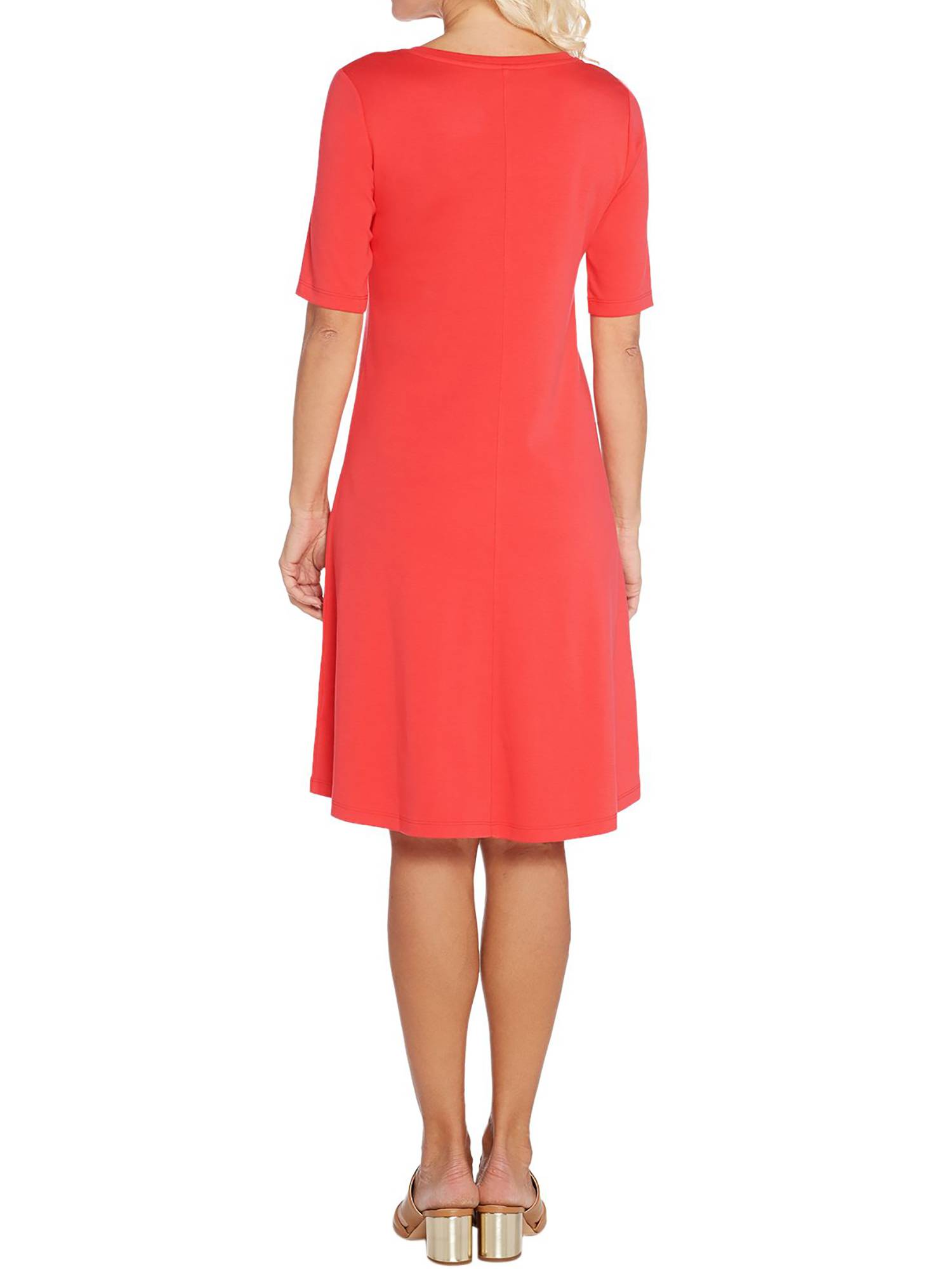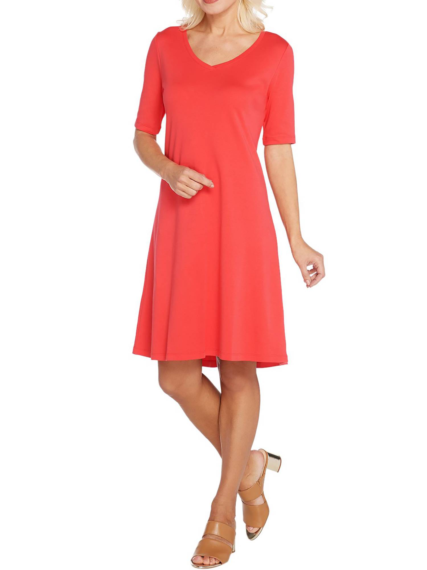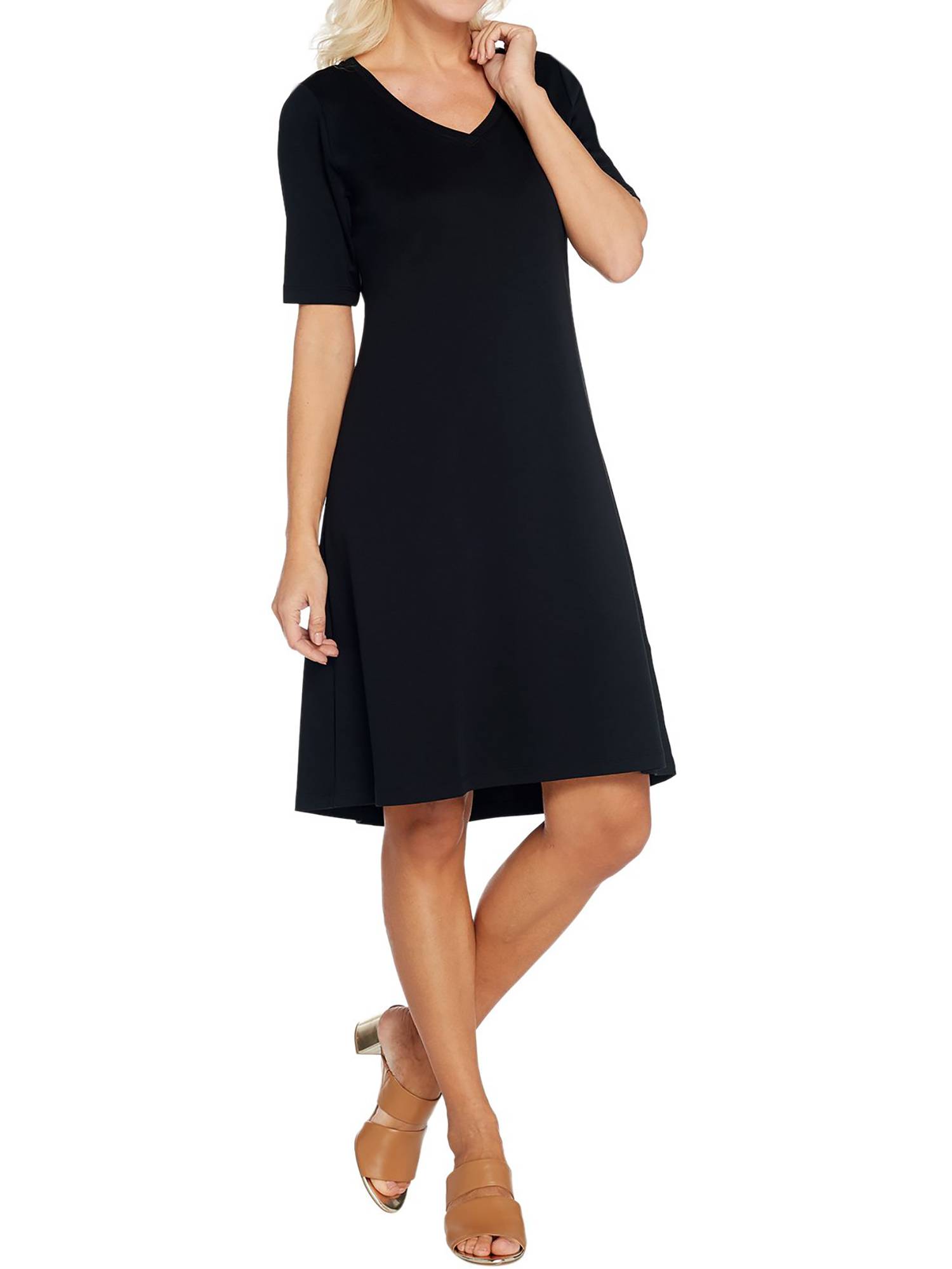 - Features: midi length, elbow-length sleeves, V-neckline, back seam detail, curved hemline