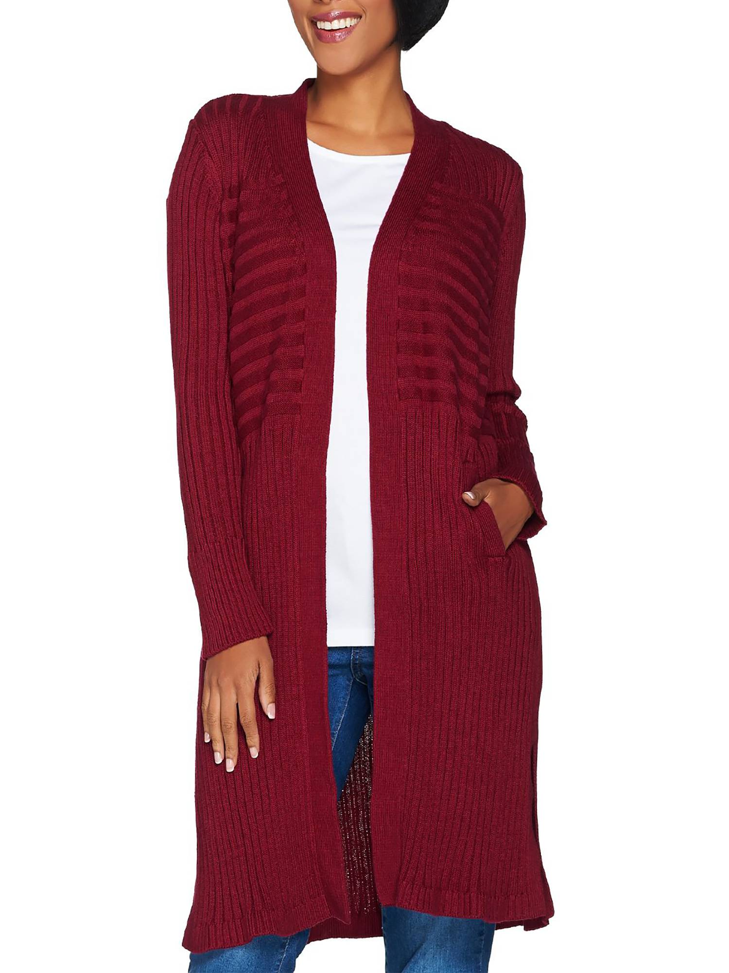Record length. The ribbing on this open front duster by Isaac Mizrahi is done in horizontal and vertical patterns, lending a cool vibe to this longer, duster-style cardigan. Tall side slits at the bottom give you ample leg room on the extended play of this great-looking cardi. From Isaac Mizrahi Live!(TM).