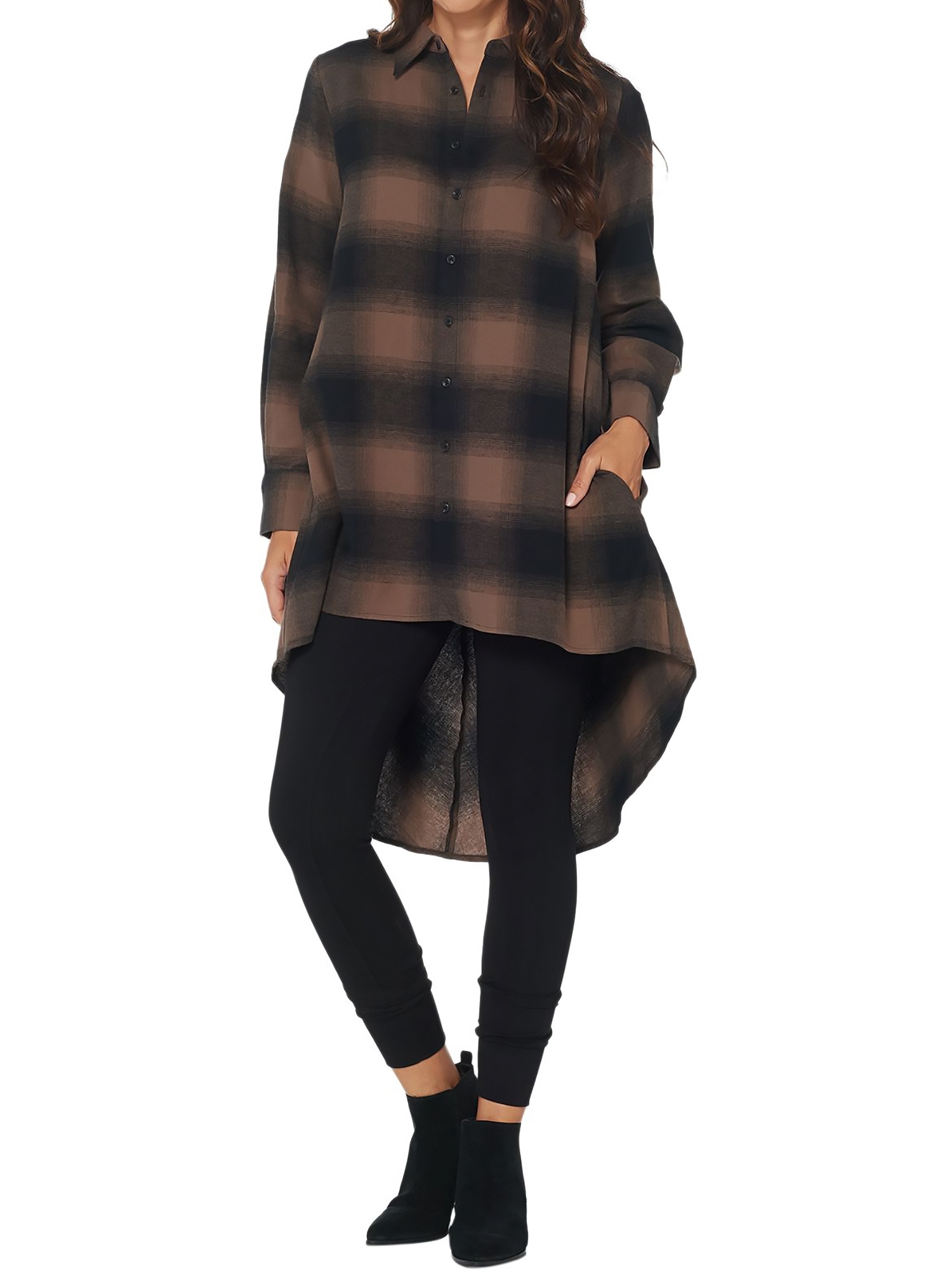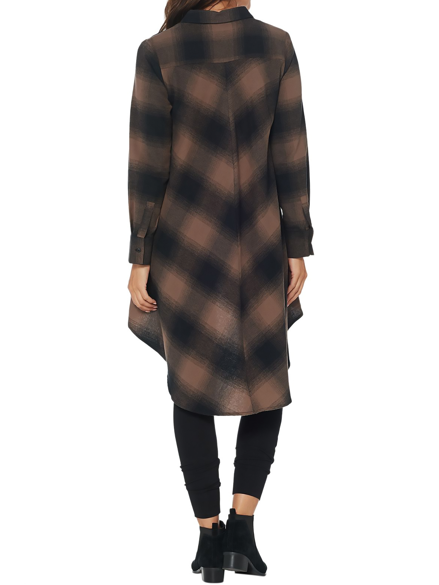 - Features: allover plaid print, button front, collar, front pockets, hi-low hemline