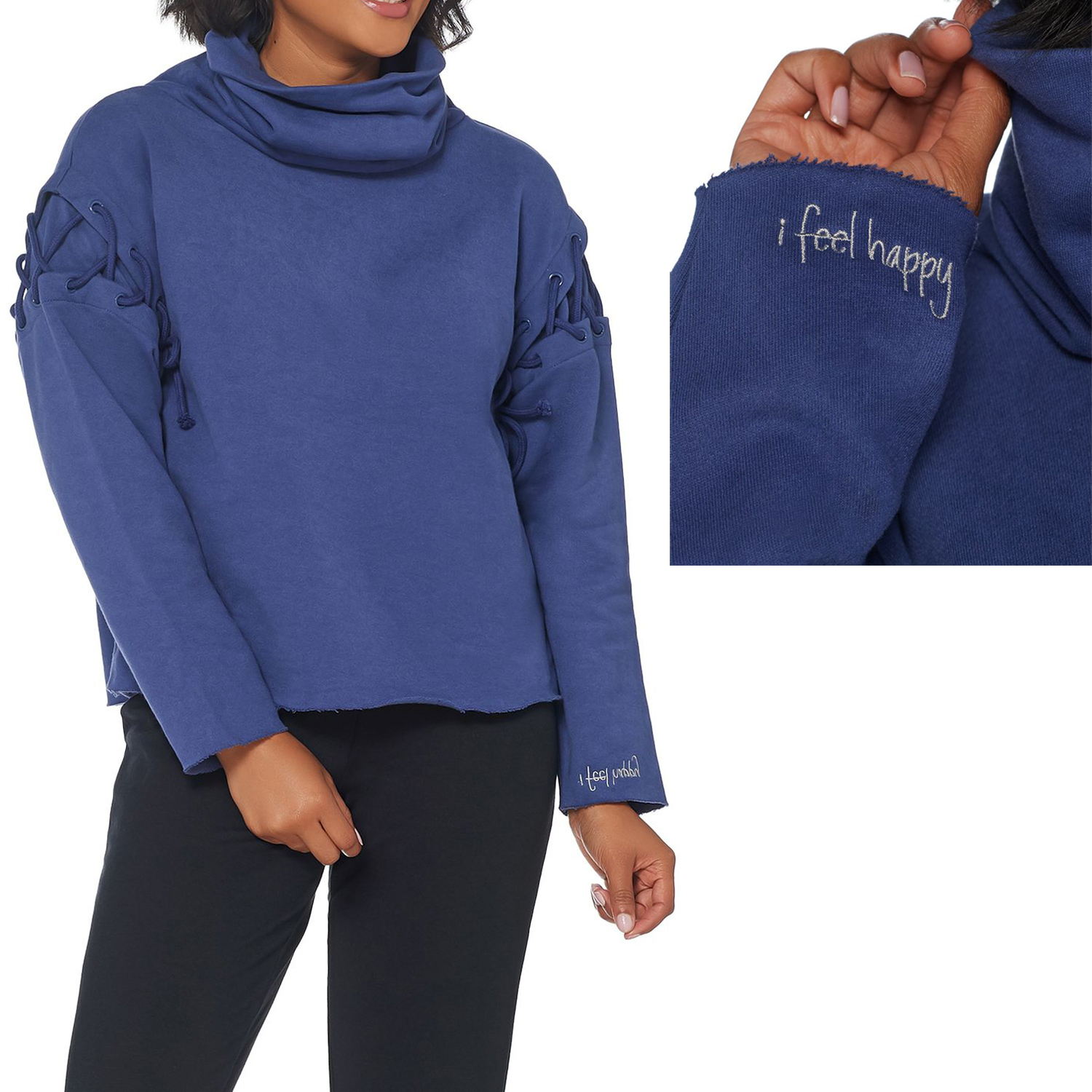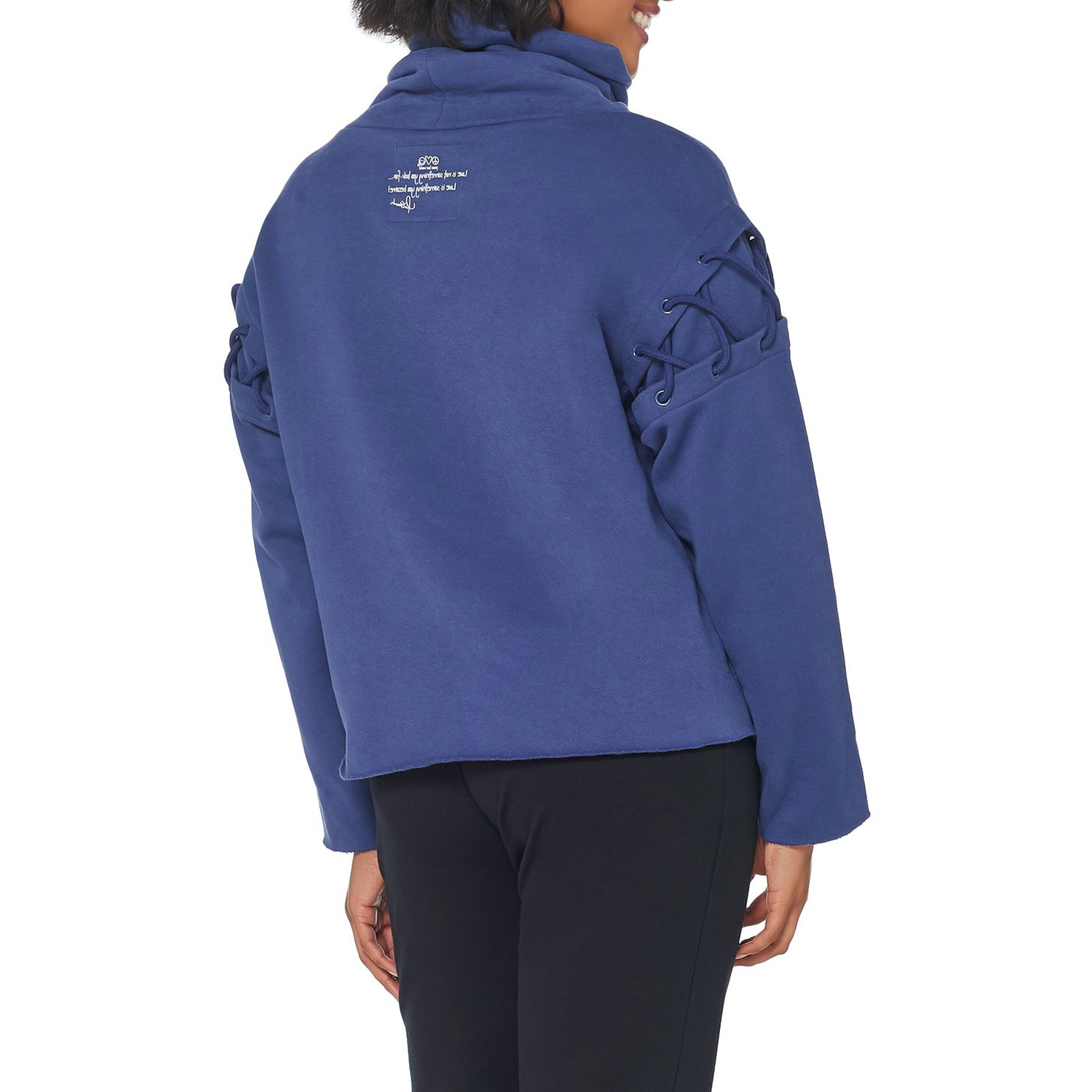 - Features: doubled turtleneck collar; cord, grommet, and lacing details on shoulders; long sleeve openings and straight hem with raw edges; inside cuff embroidery; back neck “love” print