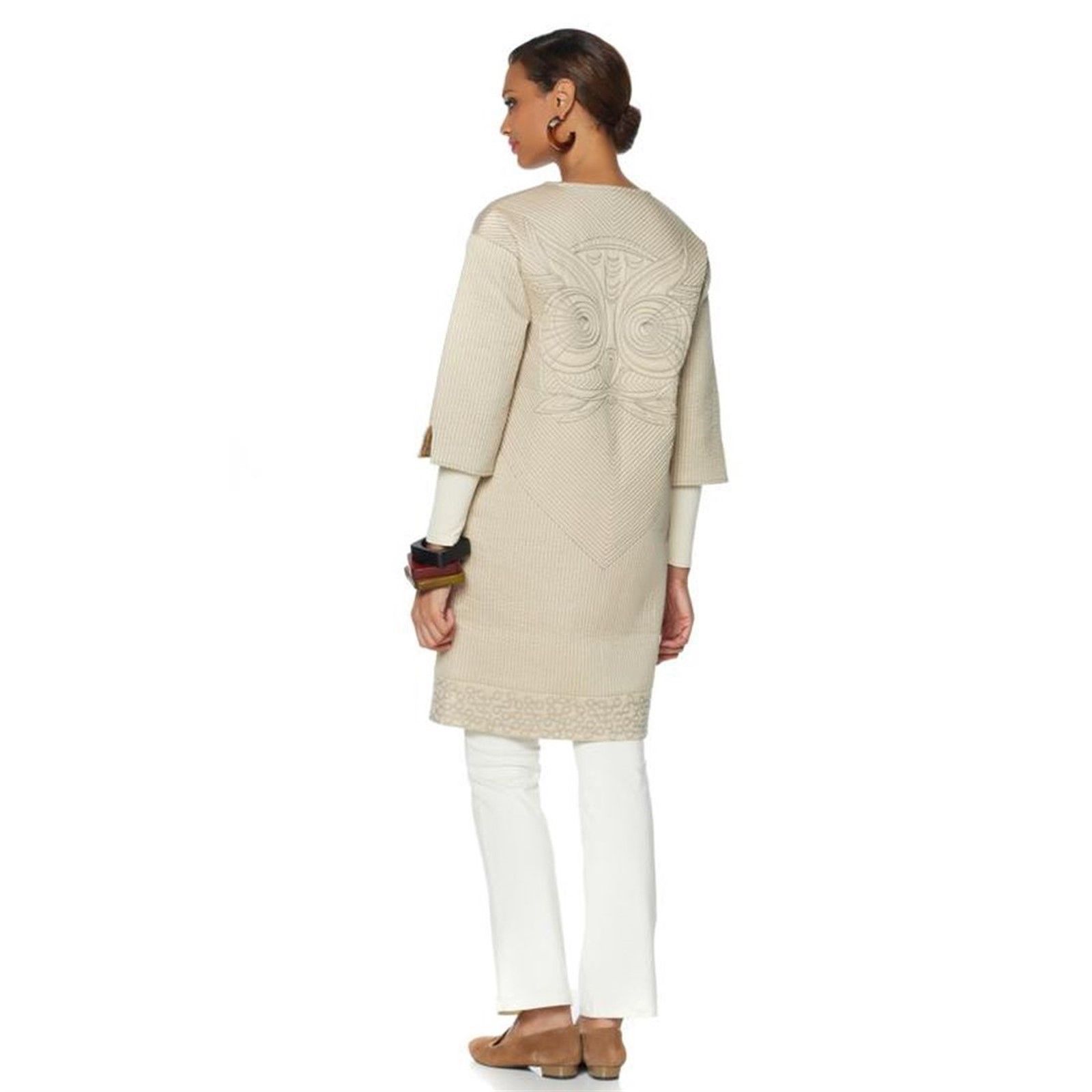Rara Avis by Iris Apfel Lightweight Quilted Owl Jacket People always turn when you walk into a room. Your innate sense of style draws you to fashions that cant help but impress, like this quilted duster jacket. The fabulous owl motif on back is repeated in the colorful lining for added whimsy. Another extraordinary piece by the infamous Iris Apfel.