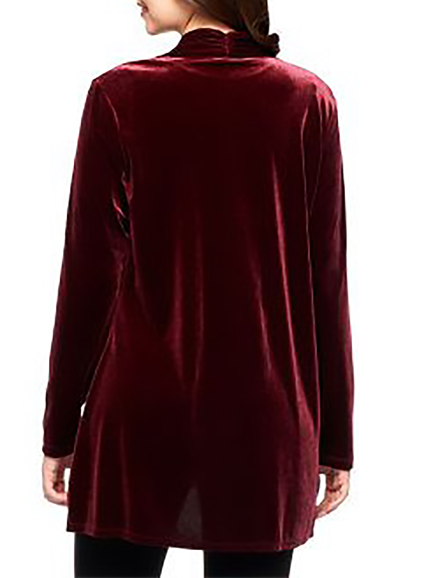 - Knit velvet, long sleeves, ruched back neck, cascade front