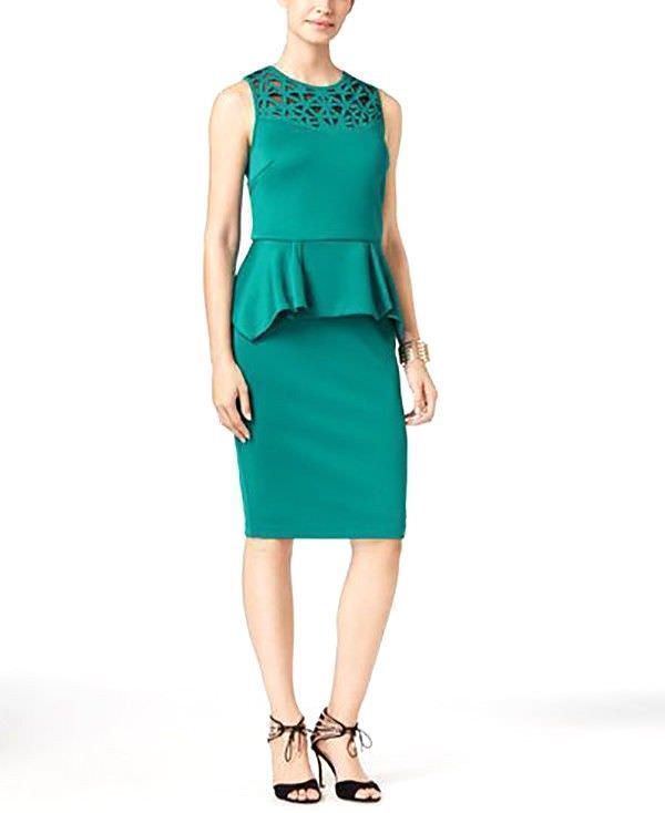 Thalia Sodis stylish dress features cutouts with mesh at the yoke, a peplum waist and a sheath silhouette perfect for the office or a special occasion.