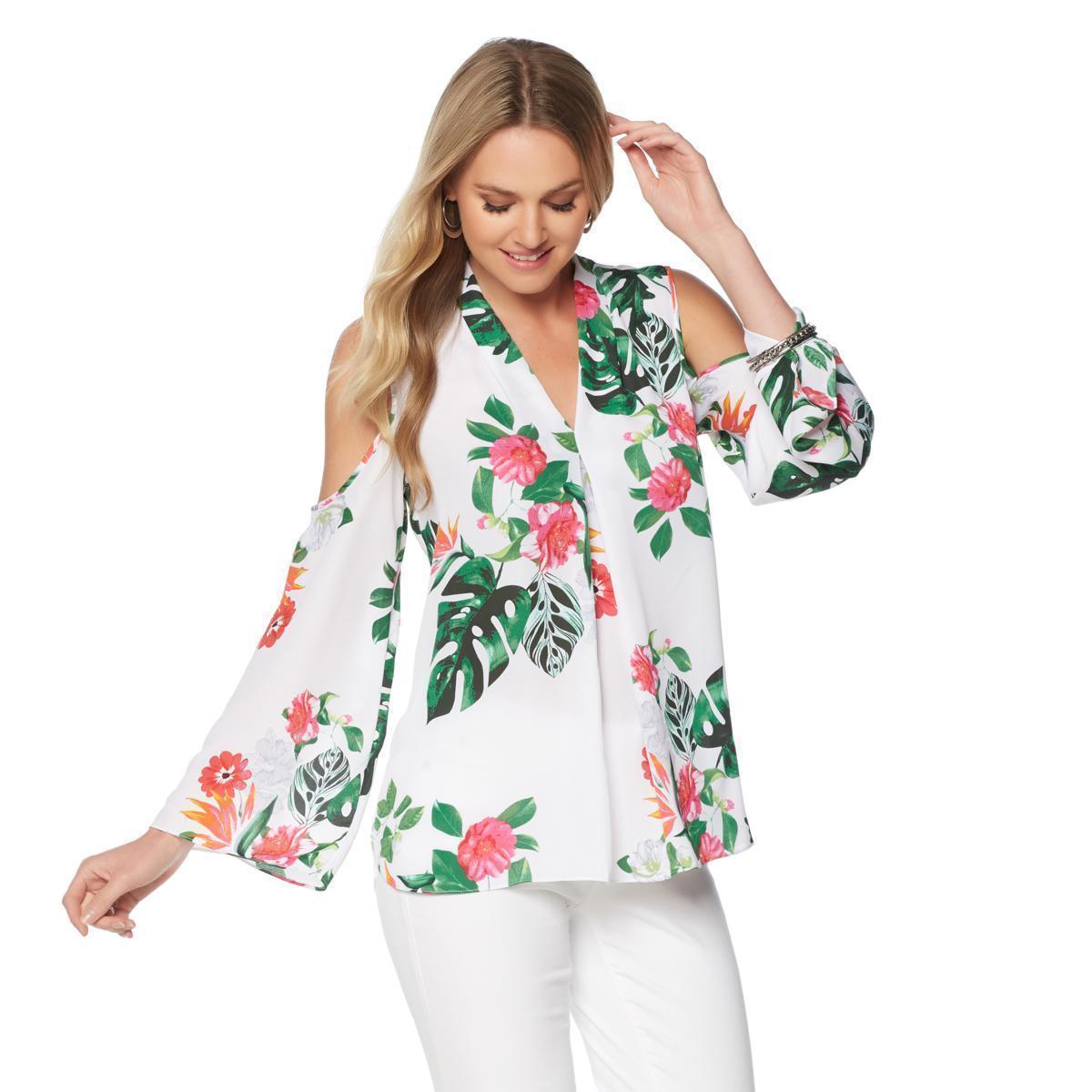 Fine dressmaker details add the finishing touch to this exceptional blouse. French seams, baby rolled hems and soft pleating work in harmony to drape you in elegance with a tantalizing twist. Cutout shoulders capture the must-have trend, enticing women of all ages to bare a tasteful amount of skin. Youll feel beautiful wearing this flattering top from Vince Camuto.